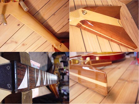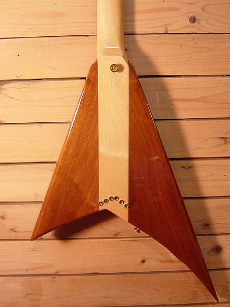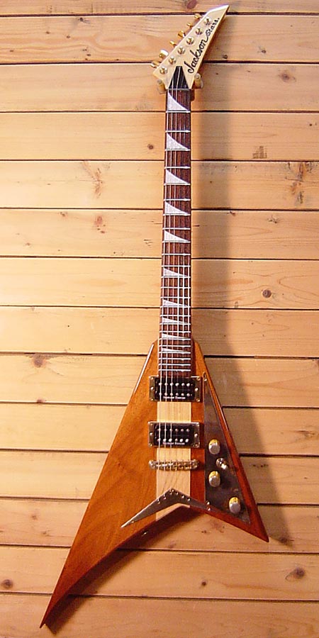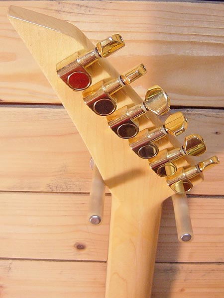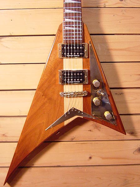 定価190,000円+税。2008年のリミテッドモデル!メタルの王道シェイプ「ランディV」にウォルナットボディーを採用した特別スペック!歯切れの良いスラッシーなリフにピッタリの一本!さらにはナチュラルカラーが大人のメタル魂を奮立たせます!!心臓部のピックアップにはSeymourDuncanのSH-5(リア)SH-2(フロント)にマウント!パワー感申し分なしです!裏通し弦なのでテンション感も強く、変則チューニングも楽に行えます。金属パーツの曇りや小傷はございますが全体的には使用感は少なめで綺麗なコンディション!フレット残量も8〜9割とたっぷり残ってございます。大人メタラーに是非持って頂きたい一本!! オリジナルソフトケース 付属。