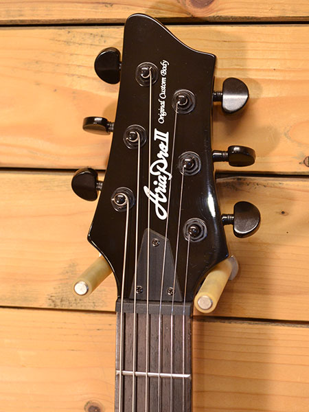 定価39,000円+税。国産老舗ブランド「アリアプロU」のフラッグシップシリーズPE。フィット感の良いボディー形状とハイフレットの演奏性が良いヒールカットネックなどを採用した人気モデルです。本機はオールブラックカラーを採用した見た目もCOOLな一本!ミディアムスケールネックにジャンボフレット採用で演奏性が良く、ピックアップにもパワー感がございます。ハードロックはもちろん今風なラウドロックなど激しめなプレイにもお勧めです。黒ボディーなので拭き傷などはございますが実質的な使用感は少なめの個体です。フレット残量も8〜9割程とタップリ残っていますので演奏性もバッチリ!大変お買得な一本です。 汎用ソフトケース 付属。