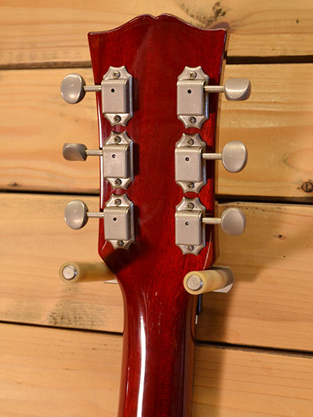 1980年代半ば頃のリバイバルシリーズ!58年レスポールジュニアのレプリカモデルです。極太ネックグリップなど細かい所まで良くレプリカされた一本です。オールマホガニーらしい太く乾いた抜けの良いサウンドが楽しめる一本です。P-90ピックアップはオーバードライブとの相性も良くブライトながらコード感のあるサウンドが演出できます。フレット残量は6〜7割程。ピックアップ下にザグリ跡(おそらくハムを乗せようとして諦めた跡)がございます。全体的にも傷など使用感のある個体ですが演奏性が良く大変お買得な一本でございます。POTなど電気部品も交換済み!即戦力な一本でございます。 汎用ソフトケース 付属。