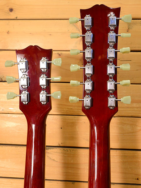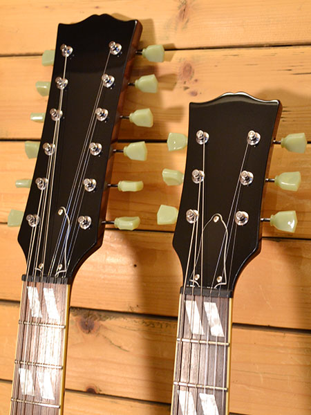 大手楽器店MusicLand KEYさんによるSG Wネック(EDS-1275)のレプリカモデル(新品時販売価格156,600円)をさらにアップグレードされた個体です。元々テールピースの位置やヘッドシルエットなど精密にレプリカされていた評判の良いモデル。そこから電気パーツをすべてUSA製に交換されています。POTはCTS、スイッチはスイッチクラフト製に交換。ピックアップは6弦側にダンカンのSH-5B&SH-1Nを搭載。12弦側にはカバードのSH-1を前後に搭載しております。コントロールノブはスピードノブに交換されています。ボディー中央のトグルスイッチ(プラの部分)はロングタイプを手作りされています。12弦側ボディートップに小さな打痕がある以外は目立った傷は無く大変綺麗なコンディションを保った個体です。滅多に出ない個体ですのでお探しだった方はお早めに! オリジナルハードケース 付属。