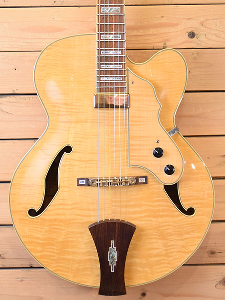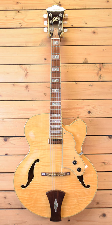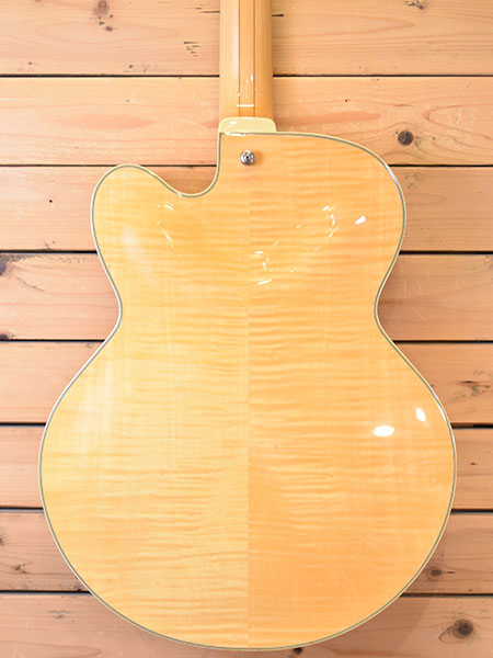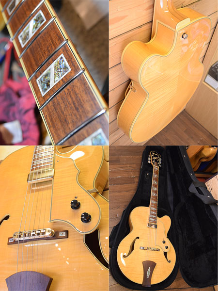 2005年製。ボディートップ・サイド・バック総フレイムメイプル仕様の本格フルアコモデル!ネックは強度にも優れた5ピースメイプル仕様。ネックエンドピックアップ仕様なので箱鳴りも良く煌びやかなで粘りのある質の良いフルアコサウンドです。ピックアップ以外の電気パーツはすべて新品交換済み。フレット残量も8分山以上とタップリ残っており演奏性も良い個体です。1PU仕様のAF105は製造期間も短くレアな個体です。お探しだった方は是非この機会に。 付属品:汎用セミハードケース。