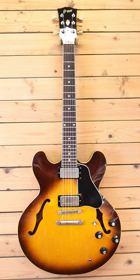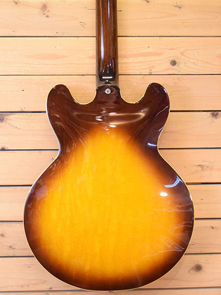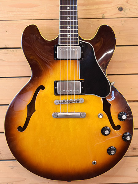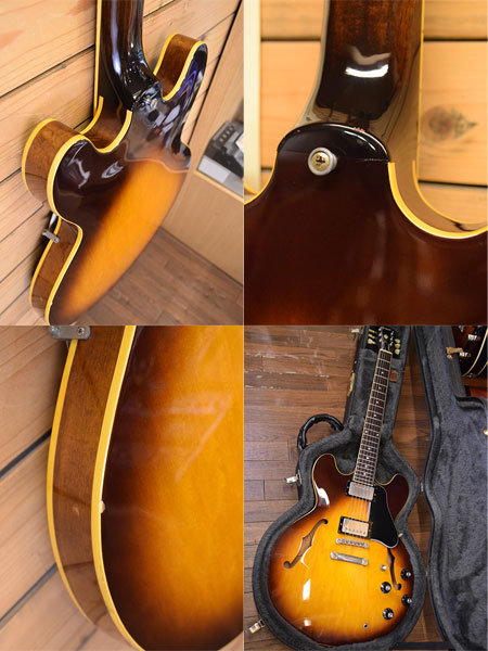 黄金期の1981年製。61年製型スーパーリアルモデル!最上位モデルSA1200と同じメイプル・マホガニーの3層構造トップ・バック仕様。クラウンインレイ期なのでピックアップはGrooveではなくPU-2が搭載されています。1200との違いはPU/指板材/ペグのみでその他の使用は同じです。ペグやブリッジなどのハードウェア・電装系などオリジナルパーツが保たれており動作もまったく問題ございません。フレット残量は7〜8分山と年式の割にタップリ残っており演奏性も良い個体です。4弦ペグに若干の曲がりがございますがチューニングは問題ございません。ネックジョイント付近に塗装クラックもございますがこちらも問題ございません。全体の艶感も残った大変綺麗な個体です。スーパーリアルのセミアコは現存数が少なくお探しだった方も多いはずです。コンディションの良い個体をお探しだった方は是非この機会に。 重量:3.9kg 付属品:Gibson製ハードケース