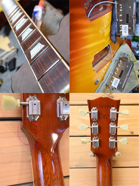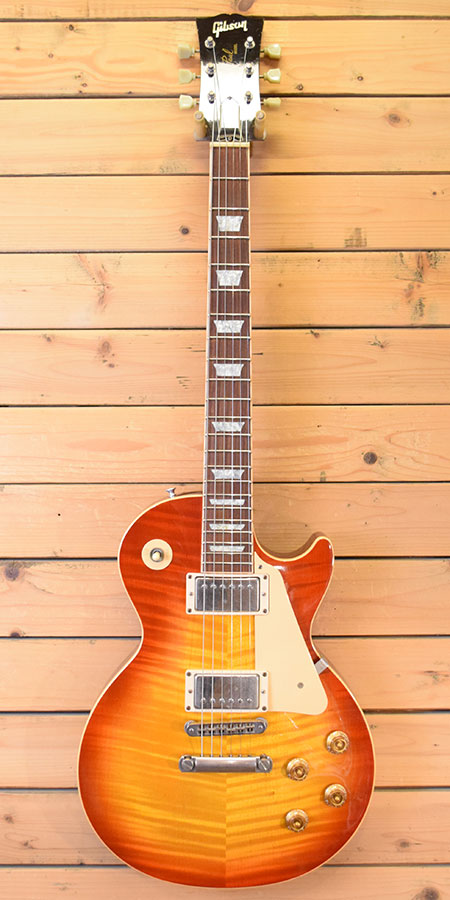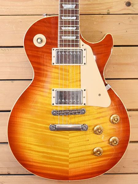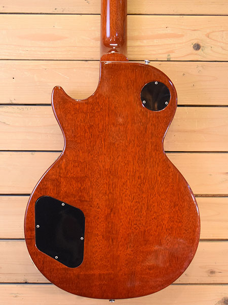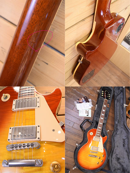 2003年製。レスポール50年目の節目として一新されたレギュラースタンダードの初期頃の個体です。それまでのレギュラーよりはボリューム感のあるネックグリップ(ヒスコレほど太くないです)やバックカラーがそれまでよりナチュラルになっておいります。ピックアップはBurst Bucker Proが採用されウォームで程良い芯のあるバランスの良いサウンドです。個体差もございますが本機は太いトラ杢が鮮やかな迫力のあるルックス!6弦側6フレネック裏付近に浅い打痕やネック付け根付近に打痕など多少の使用感はございますが、フレット残量は8分山以上とタップリ残っており演奏性の良い個体です。1Pマホガニーバック&リリーフ無しで4.2kgとバランスの良いウェイト。気になっていた方は是非この機会に。 重量:4.2kg 付属品:オリジナルハードケース(取っ手不良・鍵不良ですがケースとしては使えます)・紙類・レンチ
