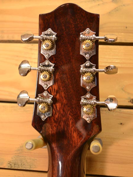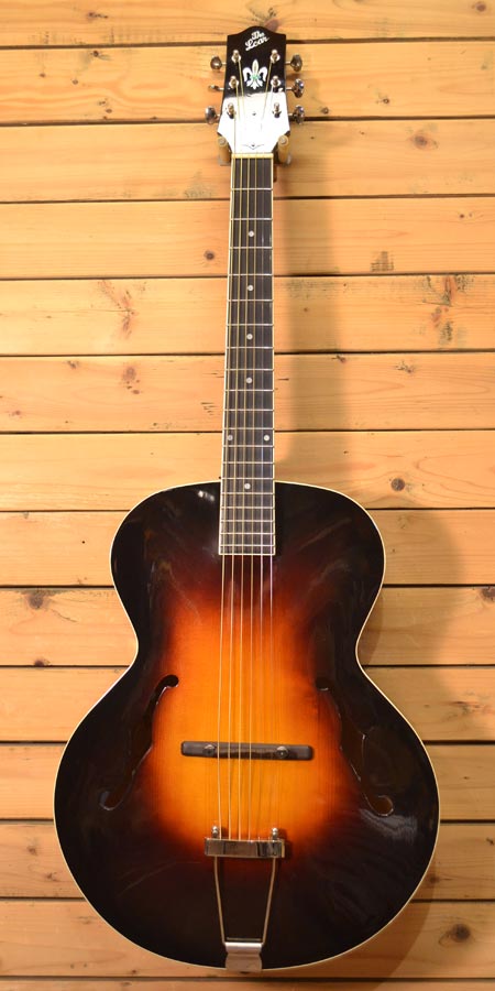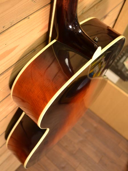 近年物では珍しいピックギター(アーチトップギター)です!トップ・バックのアーチが美しいギブソンL-5のレプリカモデルです。16インチボディーから鳴る乾いた福与かなサウンドが印象的です。ペグにはグローバー製のオープンタイプを採用。指板にはエボニー材を使用するなどコストパフォーマンスも大変高いモデルです!目立った傷も無く使用感の少ない個体(ネック裏に打痕を修復した跡はございます。凹みはございません)。お買得な一本です。 オリジナルセミハードケース(ショルダー可能) 付属。