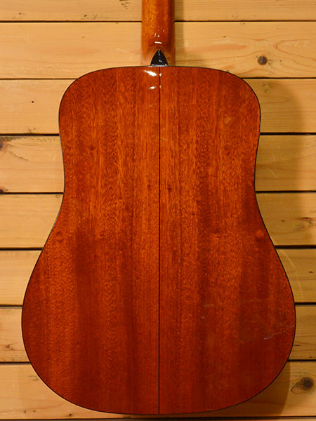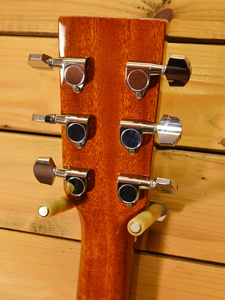 2014年製(定価100,000円+税)。オール単板仕様のD-18レプリカモデル!サイド・バックにはマホガニー材が採用され音量感があり低音の輪郭もしっかりした上質なサウンドです。フレットサイズはマーチンよりもやや高めで演奏性も良いモデルでございます。弦高はカスタムライトにて調整済みで6弦12F2.5mm、1弦12F1.9mmとバランスの良いセッティングとなっております。ヘッド上部ペグ側に塗装の剥離やボディートップに小傷など使用感がありますがフレットの減りは軽度で8分山程と演奏性の良い個体です。音量感がある鳴りの良い一本!お勧めです。 付属品:オリジナルハードケース。