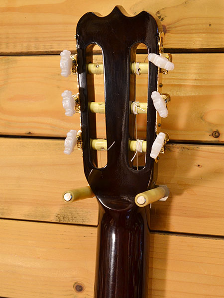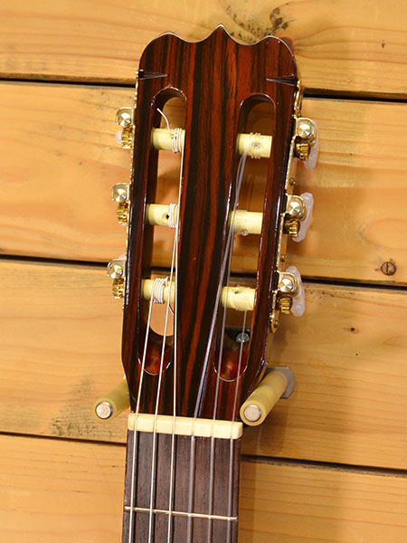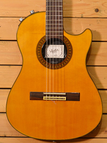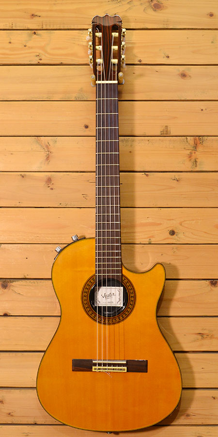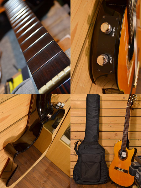 1980年代後半頃の物と思われる椎野工房によるチェットアトキンス風エレガットでございます。45mmとエレキほどのボディー厚(ボディーの空洞は少ないです)にナット幅52mmの本格クラシックギターのネックを合せたモデルとなっております。ピエゾピックアップは電池いらずのパッシブタイプとなっており出力もしっかり出ています。トータルバランスが良く扱いやすい印象のエレガットでございます。使用感は年代の割に少なめで全体的にも綺麗なコンディションです。お手頃で質の良いお勧めな一本! 付属品:ソフトケース。