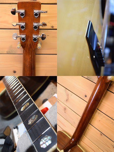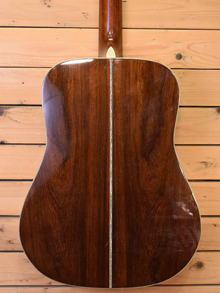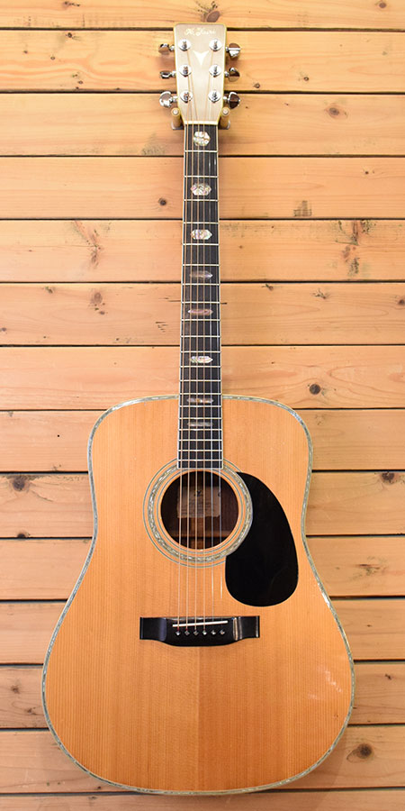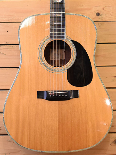 1975年製。D-41をベースにしたヤイリのオリジナルボディーインレイが美しい人気モデル!ボディートップは単板スプルース、サイドバックは杢目と導管からブラジリアンorマダガスカルローズの合板かと思われます。音量感があり低音の輪郭がある煌びやかなサウンドです。ブリッジ再接着済みですので安心してご使用頂けます(ブリッジ端にかすかな浮きがございますがしっかり脱着接着していますのでご安心ください)。弦高は6弦12F2.8mm、1弦12F2.3mmとなっております。フレット残量は6〜7部山程。ボディートップに擦り傷や塗装痩せなど使用感のある個体ですが年式の割に綺麗なコンディションです。しっかり弾き込める国産ビンテージ!お勧めです。 付属品:当時物汎用ハードケース。