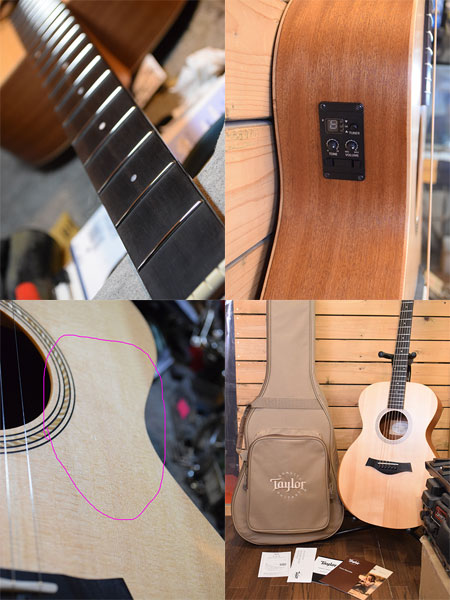 2020年製。コストパフォーマンスに優れたテイラー入門モデル!上位モデル同様のネックジョイント工法が採用されボディーは取回しの良い小ぶりなグランドコンサートサイズを採用しています。加えてショートスケールネックやボディーサイドにはアコでは珍しいコンター加工まで取り入れられています。ボディートップ(サウンドホール横)にピックスクラッチ傷はあるものの実質的使用感は少なめな個体です。フレット残量は8〜9分山。弦高は6弦12Fで2.5mmと演奏性も良い個体です。良質でブランドバリューもあるエレアコをお探しの方に是非お勧めです。 付属品:オリジナルギグケース・紙類。