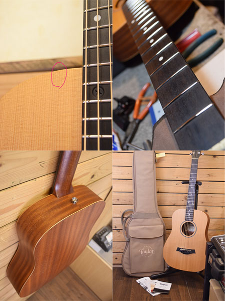 2012年製(定価96,800円)。3/4サイズとコンパクトながらテイラーらしいダイナミックで煌びやかなサウンドが楽しめる人気モデル!スプルース単板トップ、サイドバックはサペリ材を使用。ボディーバックにアーチ形状を採用しており小ぶりながら音量感がございます。ボディートップショルダー付近(4弦側の肩)に小傷がございますが使用感の少ない大変綺麗な個体です。ライトゲージにて調整済みで弦高6弦12F2.5mm程と演奏性も良い個体です。ブリッジ剥がれ修理済みでポテンシャルもバッチリ発揮しています。大変お買得な一本!気になった方は是非この機会に。 付属品:オリジナルギグケース・紙類。