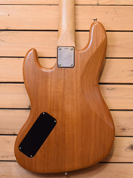 パーツ等から1980年代半ばから後半頃の物と思われるJazz Bassモデルです。ボディー材にはマホガニーを使用。ネックにはエボニー指板のメイプルネックが採用されています。ピックアップにはハイパワーなクォーターパウンド系が搭載されています(メーカー不明ですがダンカンかESP製かと思われます)。トルク調整付きペグや金属比重多めなオリジナルブリッジなど当時高額だった事が推測できるスペックです。マホガニー特有の「カンカン鳴る」感じが非常にマッチしており輪郭のあるアクティブのような低音感を実現しています(本機はパッシブです)。ボディーはオイルフィニッシュの為、手が触れる個所の剥げはございますが年式の割に綺麗なコンディションです。ナット幅38mm、重量4.1kg。有りそうであまり無いマホガニーボディーJB!気になった方は是非この機会に! 付属品:汎用ソフトケース。