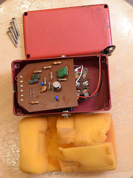 DCジャック無しの前期仕様です(LEDは電池チェッカーですのでON/OFFに作用しません)1970年代後半頃のモデルです。心臓部に缶オペを使用した珍しいディストーションです。荒くブーミーな味のあるディストーションサウンドが魅力です。筐体上部に穴を空けた箇所がございます(電池スナップを外に出せるようにしたようです)もちろん使用には問題ございません。電池スナップ新品交換済み。音の空気感(歴史感)を変えたい方にもお勧めです。 付属品:無し。