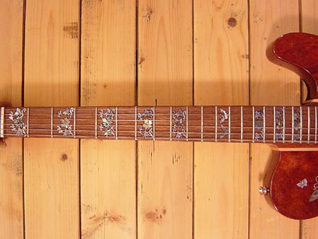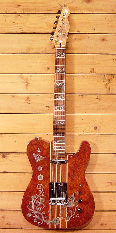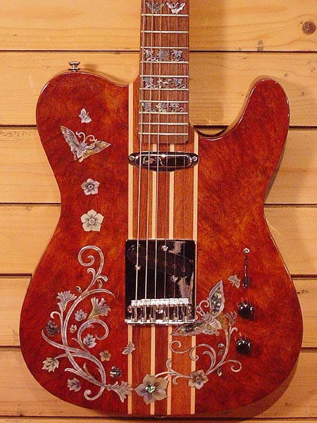 台湾サムズ工房のボディーからヘッドまで超豪華インレイを施されたテレキャスモデルです!ギターとしての完成度も高く価格以上のポテンシャルを持っている一本です。ナットなど量産品と思わせる部分などはございますが木部やペグなどのハードウェアはしっかりしたものを使っていますのでプレイにはストレスを感じません。お値段的にも気軽に持ち運べるお買い得な一本です!使用感も少ない大変綺麗なコンディションです。 オリジナルハードケース 付属。