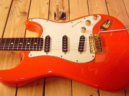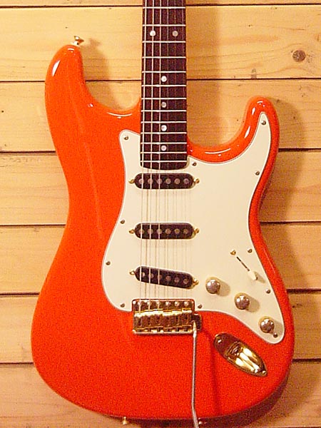 1990年代前半イーストシリーズの中の1本!日本ではもちろんですがヨーロッパでも大変人気の高かったモデルでハイクオリティーコンポーネントの代名詞の様なストラトモデル!ボディーのみ近年ラッカーによるリフィニッシュが施されており、サンバースト→フェスタレッドとなっております。フェンダーのフェスタレッドよりオレンジが若干強めで鮮やかなカラーとなっております。金属パーツの曇りなどはございますがボディには傷などなく綺麗なコンディションとなっております。フレット残量は7分以上とまだまだこれからです!大変弾きやすくパワーバランスの良いお勧めの一本です! Gigケース 付属。