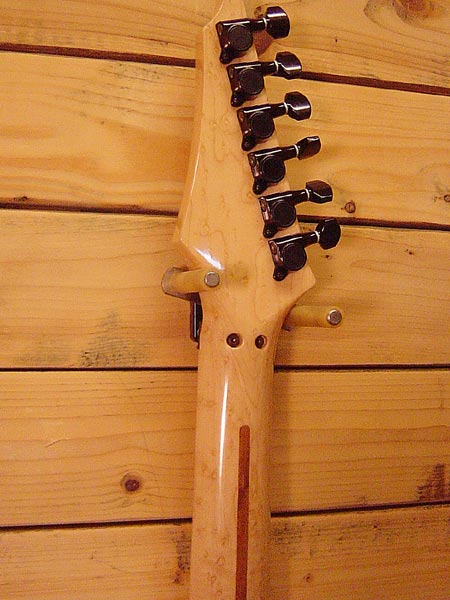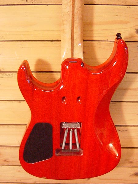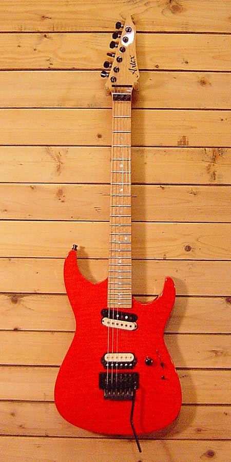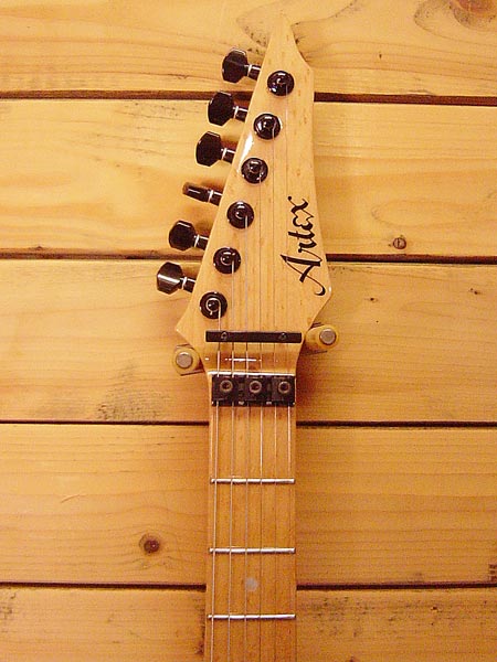 国内ハンドメイド工房でも知られる「アーテックス」製のオーダーギターです!なんとボディートップ?(むしろ半分)はトラ目の美しいメイプル材を贅沢に使用、バックのマホガニーの目も良く、見た目にもサウンド的にもバランスの良い一本です。ネックジョイントは独創的な3点ボルトオンとなっており、ハイフレットの演奏性はかなり高くなっております。ブリッチにはオリジナルフロイドローズをマウント!ピックアップは不明でございます。プレイヤービリティーの高い一本をお捜しの方には是非ともお勧めです! 汎用GIGケース 付属。