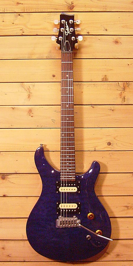 老舗「東海楽器」のPRS(ポールリードスミス)風な一本!前オーナー様がトレモロユニットをGOTOH製ウィルキンソンに交換、VO・TONEをCTS(USA製)に交換、その他ベルデンの配線やオレンジドロップトーンキャパシターなどを搭載、ブリッチ下のアンカー強化などかなり愛情を注ぎ込まれた使用となっております。フレット残量もまだまだタップリ残っており大変お買い得な一本です! オリジナルGIGケース 付属。