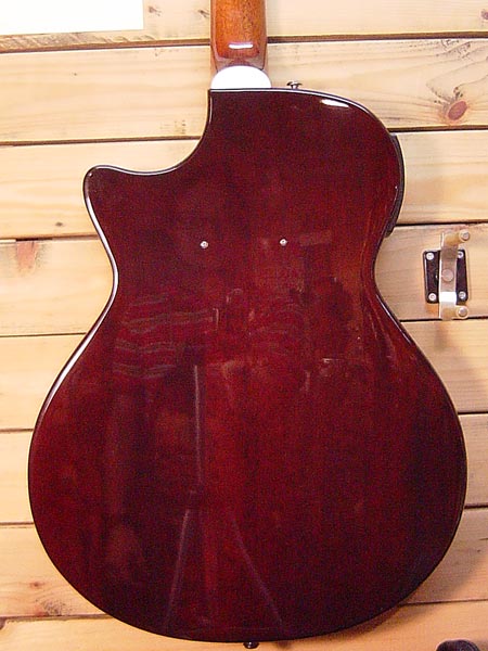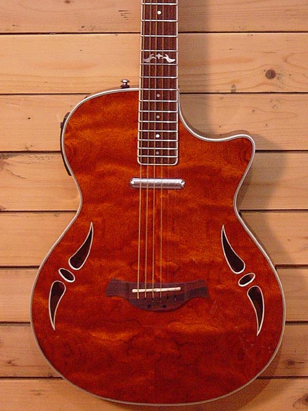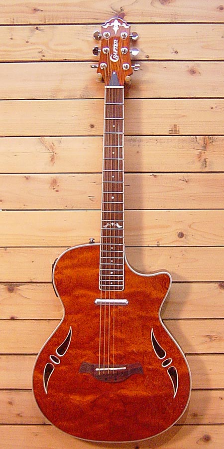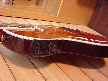 定価81,900円。ブビンガトップのフルアコ構造の一本!ケントアームストロング製のリップスティックピックアップ、L.R.Baggsのピエゾピックアップ&プリアンプと大変贅沢な使用となっております。弦にはアコースティック用のブロンズ弦を張っており他には無いサウンドとなっております。使用感も少なく綺麗なコンディションでお勧めな一本です! 汎用ギグケース 付属。