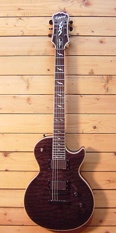 定価113,400円。ギブソン直系ブランド「エピフォン」の限定オリジナルモデル!王道のシルエットですが、ピックアップにはEMG 81(R)/85(F)を搭載、ジャンボフレット(24F)と超モダンな仕様のレスポールとなってます。ネックグリップつや消し(ザラザラしている)で質感が良く、エンド近くまで薄めなグリップですので早弾きにも適しています。使用感も少なく綺麗な一本!大変お買得です!! オリジナルギグケース 付属。