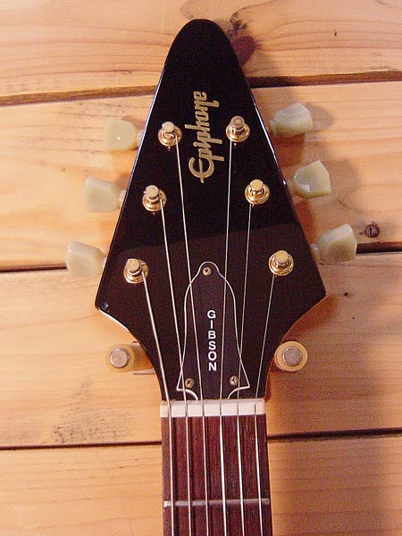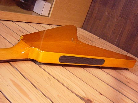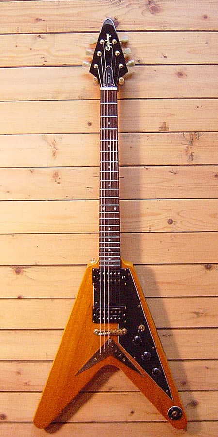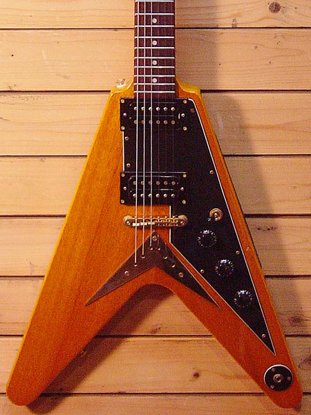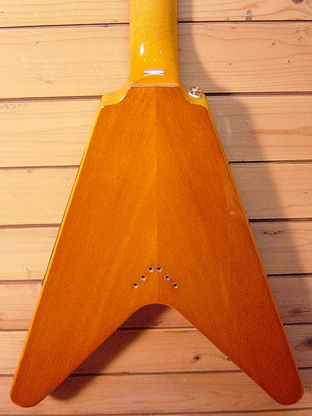 1999年製。幻のギター1958年コリーナ材フライングVのレプリカモデル!コストパフォーマンスと完成度の高い人気のモデルです。枯れた抜けの良いサウンドはロックのみならず幅広く対応!重量も2.9Kgと軽量で生鳴りもGOODです。パーツの錆や細かい傷など使用感はございますがバッチリ調整済みですので安心してプレイ頂けます。ネックジョイントサイドに塗装クラックがございますが中の材には問題ございません。 ソフトケース 付属。