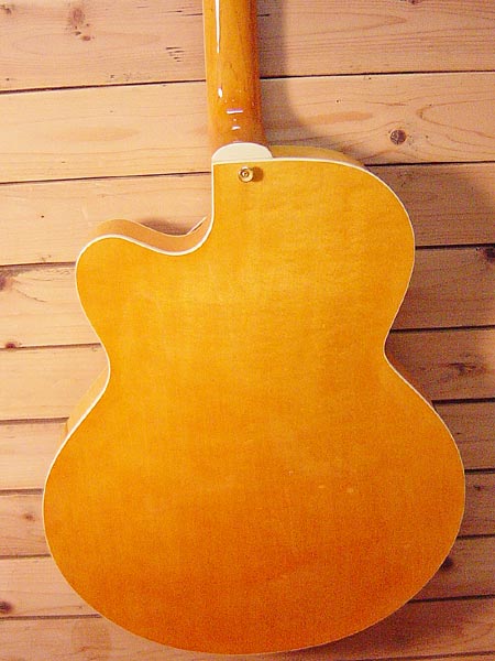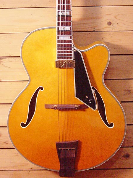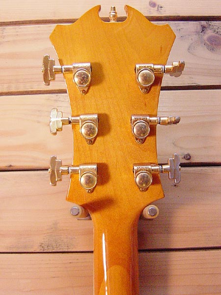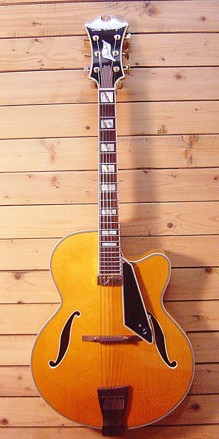 ダキストニューヨーカーモデルのレプリカ!造りも良くパーツなどから大変コストパフォーマンスの高い一本だと思われます。ネック精度が大変良く、現在フラット弦にて調整済みですが、ロッドもまだまだしっかり余裕があり、弦高も低く大変弾き易くなっております。金属部品の曇りなど多少の使用感はございますが、大きな傷なども無く全体的には綺麗なコンディションです。弾き易くお手頃なフルアコをお捜しだった方には是非お勧めです! 汎用ソフトケース 付属。