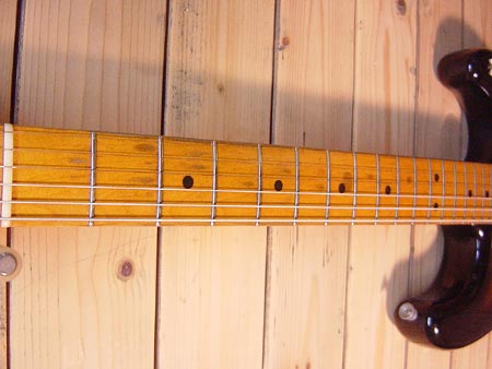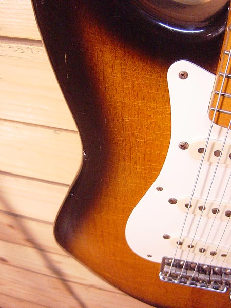 1986年製。フレディー・タバレスの監修の元で復元された1957年レプリカモデル。ヴィンテージシリーズの初期モデルです!ネックグリップは細めで質感の良い仕上がりとなっております。経年変化によりボディー全体のウェザーチェック(塗装クラック)も雰囲気良く入っております!フレット残量も平均で7割は残っておりプレイヤーズコンディション。ピックアップはオリジナルですがポット類とキャパシターは交換されております。(ビタQコンデンサー)全体的な雰囲気の良いヴィンテージライクな一本です。 フェンダーハードケース(80年代樹脂製) 付属。