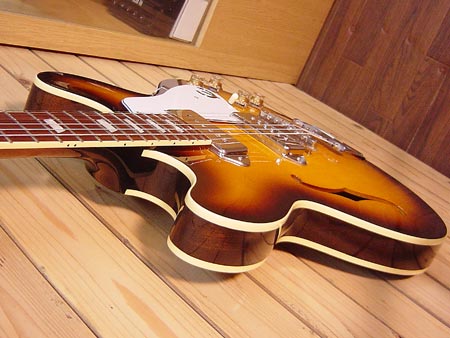 定価200,500円。Made in Japan(寺田楽器製)のエリートシリーズのカジノモデルです。フルアコ構造ですので生鳴りも大きくプレイヤーを大変気持ちの良くしてくれる一本です。重量がなんと2.8kgと大変軽量な個体ですので、軽く鳴りの良いカジノをお捜しの方に是非お勧めです。使用感も少なく綺麗なコンディション!お買得です。 オリジナルハードケース 付属。