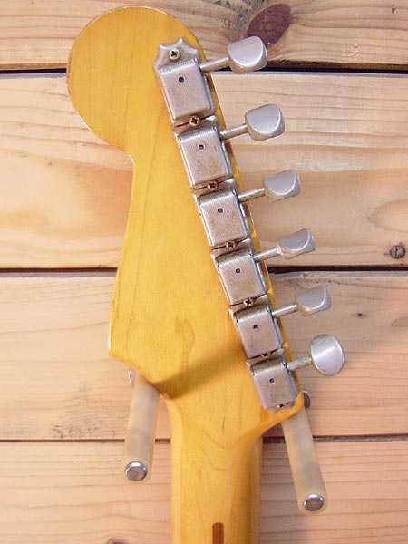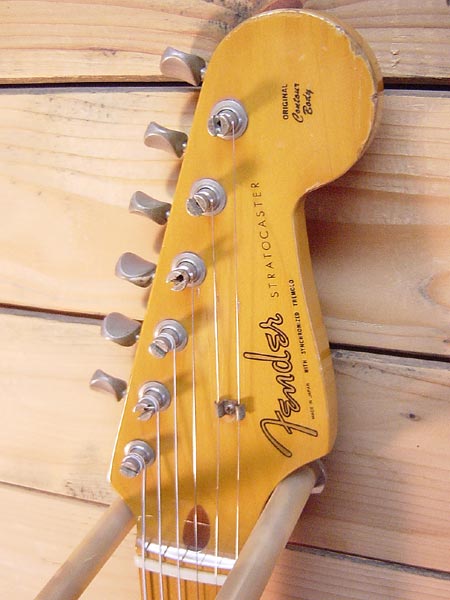 JVシリアルの1983年製。アルダーボディー、メイプル1ピースネックの1957年ストラトモデル!塗装のクラック、打痕など歴戦の傷跡が大変良い雰囲気の一本!電気系は近年にオーバーホールされているようです(ジャックは今回新品交換しています)。ピックアップはリア以外はオリジナルです。ナット交換済み、フレットすり合わせ済みで残量は6〜7割程度となっております。現在009-042ゲージでトラスロッドには若干の余裕はございます。しっかり調整済みの即戦力!お買得なJVです! 汎用ソフトケース 付属。