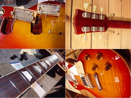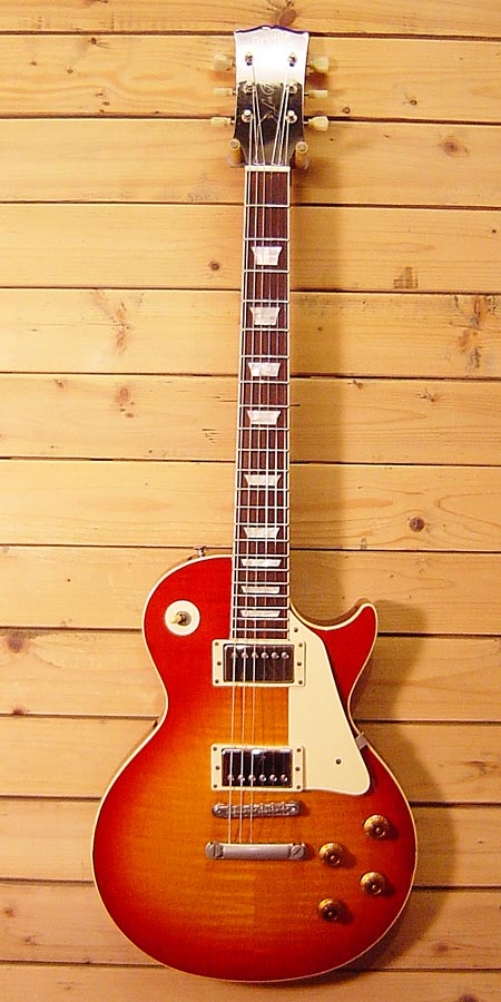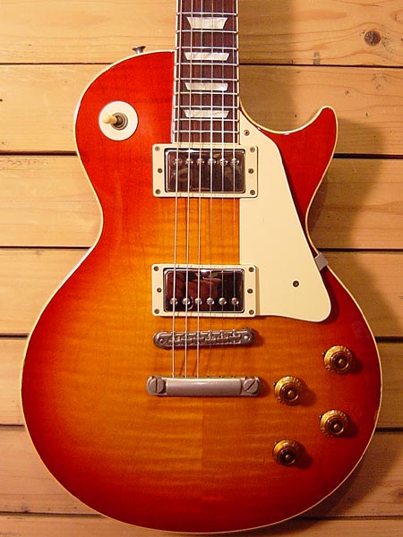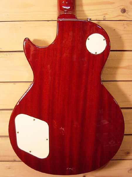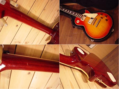 1990年製。寺田楽器製造のレスポールスタンダードモデルです!太めなトラ目が鮮やかな一本。なんと無垢のハードメイプルなんです!この時期はリミテッドモデルでラミネートのトラ目材のモデルもございますがこちらはスタンダードモデル。ピックアップはギブソンの刻印タイプ「490」がマウントされています。ネックジョイントはロングテノン(ディープジョイント)を採用しており奥行きのあるサウンドでございます。チェリーカラーですが、やや退色しておりアイスティー風な良い雰囲気に育っています。リナット・エスカッション交換以外はオリジナルコンディション!フレットは7割程度の残量です。ウェイトは4.4kg。お買得です! オリジナルハードケース 付属。