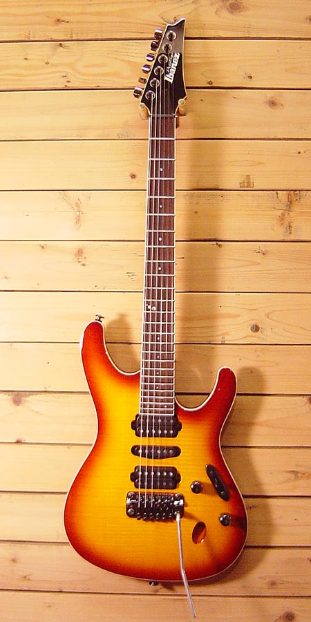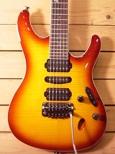 2012年製(定価200,000円+税)。Serious Versatilityの名に相応しい多彩さと精度を求めた究極のコンポーネント!世界的に見ても精度の高いアイバニーズのパーツと木工技術!空気を押しているかの様な滑らかなアーミングが可能なベアリング内蔵のトレモロブリッジ、常に一定のテンション感が保てるロック式ペグ(弦がオートカット)、テクニカルなプレイでもストレスの無い極薄のウィザードネックグリップ、パワーバランスの良いオリジナルピックアップなどとにかくプレイヤビリティーを追求した一本です。使用感が殆ど無く大変綺麗なコンディション!お買得です! 汎用ギグケース・工具・紙類 付属。