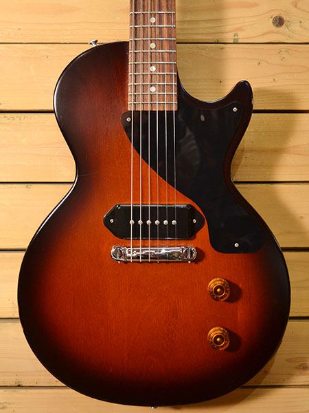 2011年製。シンプルだからこそ奥の深いモデル「レスポールジュニア」!フロントピックアップが無い事で歯切れの良さと音伸びに特化しています。リア一発のみでありながら歪ませてもコード感もバッチリ!ロックな一本です。ペグはクルーソン製の白ボタンタイプに交換されています。コントロールノブもスピードタイプに交換。落ち着いたルックスとなっております。塗装が薄いためボディーサイドに数か所塗装剥げがございますが全体的には使用感の少ない綺麗なコンディションです。重量3.7kgとバランスも良い一本です。 オリジナルギグケース・紙類・レンチ 付属。