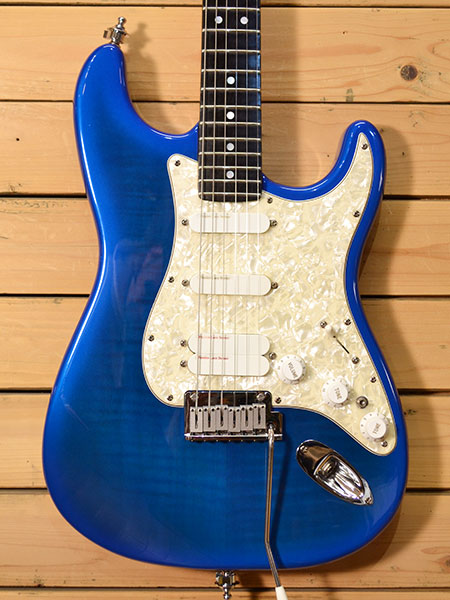 1994年製。Strat Plus Seriesの最上位モデル!製造期間が短くレアな一本です。ボディーはアルダー材をトラ目メイプルでサンド!指板にはエボニー材にシェルインレイを採用。LSR Nutやロック式ペグを使用!レースセンサーピックアップを4基搭載し、リアはスイッチでブリッジ側シングル→ハム→ネック側シングルの切換えが可能!ブリッジは現在アメスタ用に交換されていますが純正のフロイドローズ製ロックブリッジも付属してます(使用感少ないです)。ジェフ・ベックモデル初期の仕様に近い魅力的なモデルです。使用感が少なめで大変綺麗なコンディション!フレット残量は7〜8割と年式の割にしっかり残っており演奏性も良いです。当時のレギュラーシリーズの中でも上位モデル!お買得です! オリジナルハードケース・オリジナルブリッジ・ストラップ・紙類 付属。