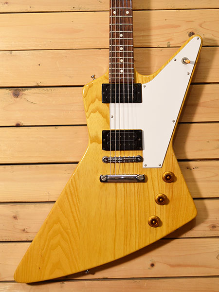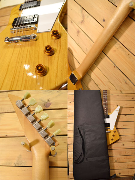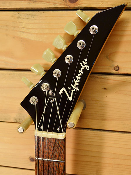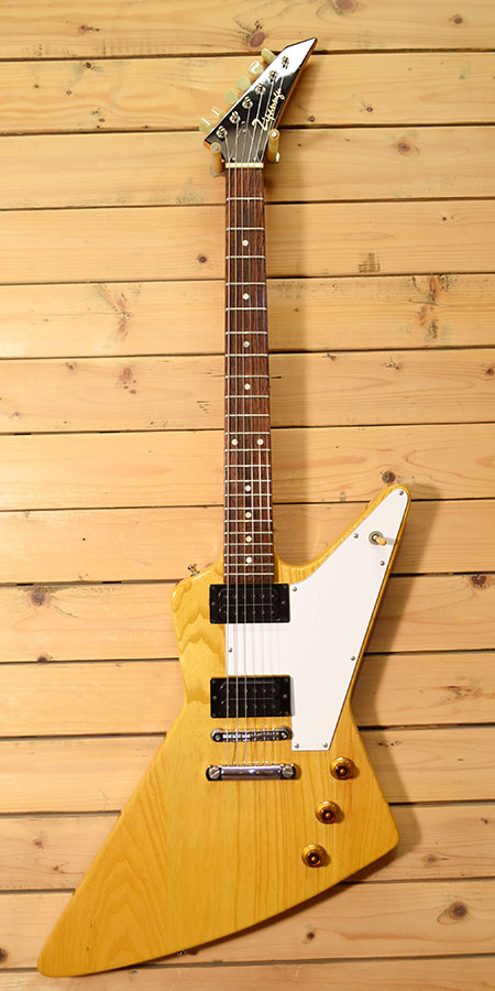 Combat製の楽器店オリジナルブランド「ジパング」のエクスプローラーシェイプモデル。ネックジョイントはデタッチャブル(ボルトオン)を採用しボディーにはライトウェイトアッシュ材を使用しています。ネックはメイプル+ローズウッド指板を採用するなどギブソン系とフェンダー系をミックスしたような仕様の一本です!ボディー塗装は薄くアッシュの質感が見た目にも伝わります。ピックアップにはディマジオのDP-215(EVO2)がリアに、DP158(EVO)がフロントに搭載されており、アッシュボディーも手伝ってブライトで奥行きのあるサウンドが楽しめます。トータル的に乾いたフェンダーよりなサウンドに感じられる一本です。(ハムのパワー感もございます)。細かい傷やヘッドトップにネジ穴跡、裏のコントロールカバー交換(ちょっと歪です)など使用感はございますが、フレット残量は8割程(ジャンボフレット)とタップリ残っており演奏性の良いコンディションです!ちょっと変わったエクスプローラー!好きです! 汎用ギグケース 付属。