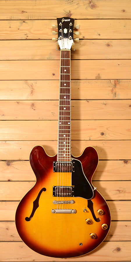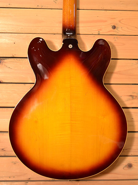 1990年代前半から半ば頃のES-335レプリカモデル。経年変化も手伝ってか程良い箱鳴りが大変心地良い個体です。音の立ち上がりも良くジャズからロックまでしっかりカバーできる一本です。交換パーツなどは無いと思われピックアップもモデル不明ですがPAFライクな出力の使い易いサウンドです。打痕や小傷など多少の使用感はございますがフレット残量7〜8割とタップリ残っており演奏性の良い個体です。大変お買得なセミアコモデル!気になった方はお早めに。 Epiphone製ソフトケース(アコ用?) 付属。