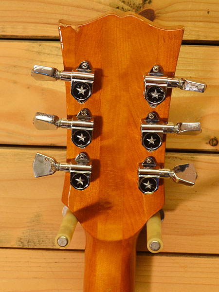 1974年製(ピックアップデイトから判断)。市場にあまり出回らないレスポールデラックスのレプリカモデルです。パンケーキ構造のマホガニーボディーにメイプルネック(指板はエボニー)をボルトオンにてセットした時代を感じさせる一本です。マクソン製のミニハムバッカーはパワーバランスが良く、程好いコシと抜けの良い印象なサウンドです。当店の見立てではなんとフルオリジナルコンディション!金属パーツのコンディションも45年前とは思えないメッキ状態の良さを保っています。残念ながらトラスロッドはほぼ締められており、現在09-42弦でネックはほぼ真っ直ぐな状態です。フレット残量は4〜5分山残りと低めですが演奏は可能な範囲でございます。ネック裏に打痕や4弦ペグの曲りが若干ございますが全体的には大変綺麗なコンディションでございます。気になった方は是非この機会に! 付属品:汎用ハードケース(当時物)。