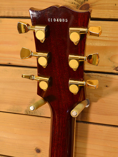 1991年製(寺田楽器製造)。Gibson USA Pickupを搭載した上位グレード。マホガニー+メイプルボディにマホガニー+ローズ指板ネックを採用した王道ウッドスペック!煌びやかさとファットでロングサスティーンを兼ね備えたレスポールらしいサウンドが楽しめます。小傷やボディー裏にバックル押し傷は見られますが年式の割に金属パーツなどの状態が良く全体的に綺麗なコンディションの個体です。フレットは擦り合せ作業済で6〜7部山程残っておりますので演奏性もまだまだ良いです。材質も造りも良いお勧めの一本です。気になった方は是非この機会に!