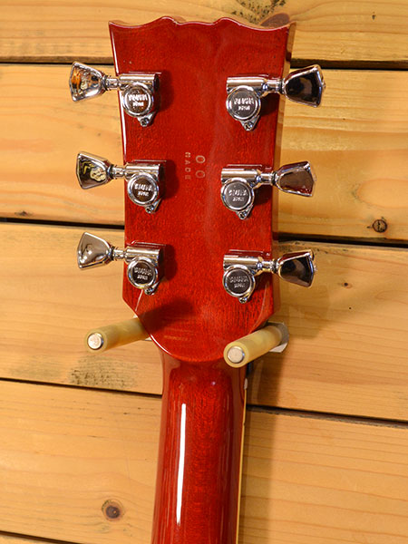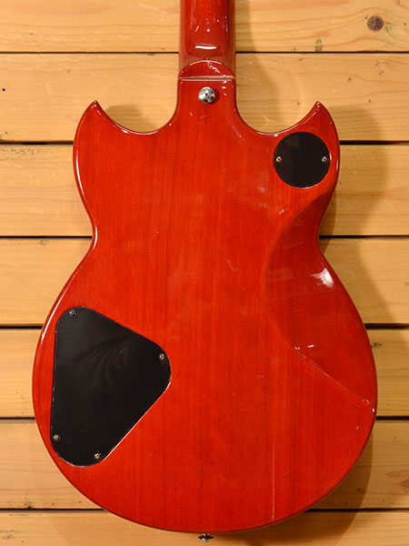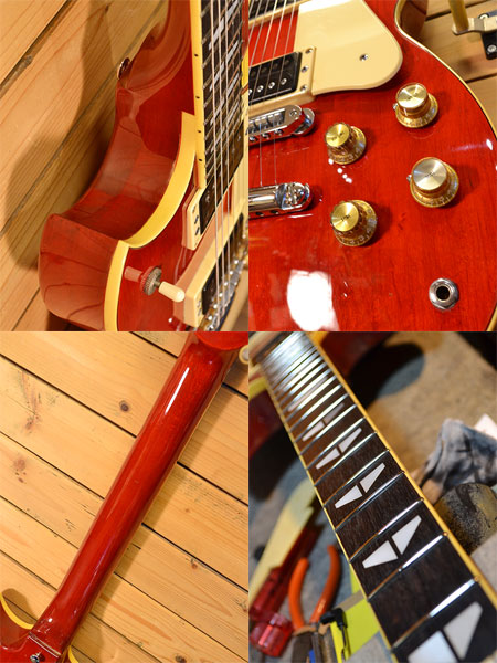 1979年製。SG800の初期個体です。パーシモンレッドカラーの鮮やかな色合いが印象的です。マホガニー+メイプルトップボディーと王道ウッドスペックならではの音伸びの良さと太さが魅力です。金属パーツの錆などが軽度で全体的に綺麗な外装の個体です。現在09-42ゲージでネック調整済みでトラスロッドにはもう少し余裕がございます(10-46ゲージも大丈夫かと思いますがロッドの余裕は少なくなるかもしれません)。フレット残量は6〜7部山と年式の割にたっぷり残っており演奏性も良い個体です。ボディーカッタウェイ付近に白濁が出ておりますが演奏や音には問題ございません。コントロールノブはリア側がLP用に交換されています。トータルバランスの良いお勧めの一本! 付属品:汎用ソフトケース。
