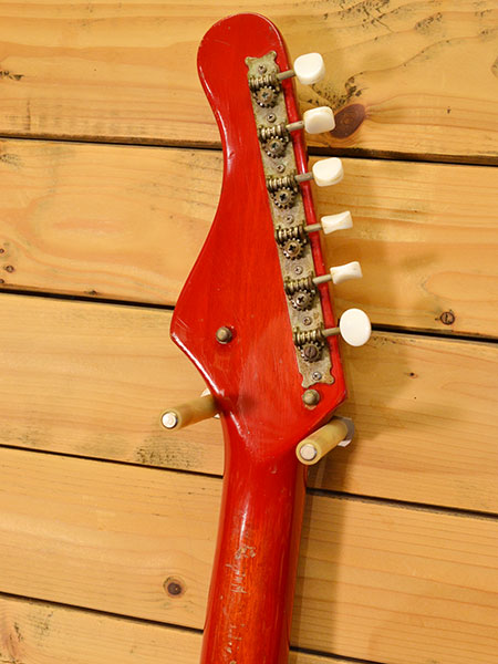 1960年代半ばから後半頃にマツモクにて製造されていたビクターのエレキギターです。自社レーベル在籍の三田明氏や橋幸夫氏などに広告に起用したり当時超売れっ子のシルヴィ・バルタンをカタログに載せるなどの甲斐あって当時大変売れたモデルであります。現代のギターには無い独特なデザインとサウンドは今でも十分な魅力があります。ネックコンディションも良好で(近年のギターのようにロッドの効きは良くありません)フレットもビザールの割にしっかり残っており演奏性もまずまずの個体です。弦高は6弦12Fで2mm、1弦12Fで1.8mm程となっております。ビザール入門にして鉄板のモデル!気になった方は是非この機会に。 付属品:汎用ソフトケース。