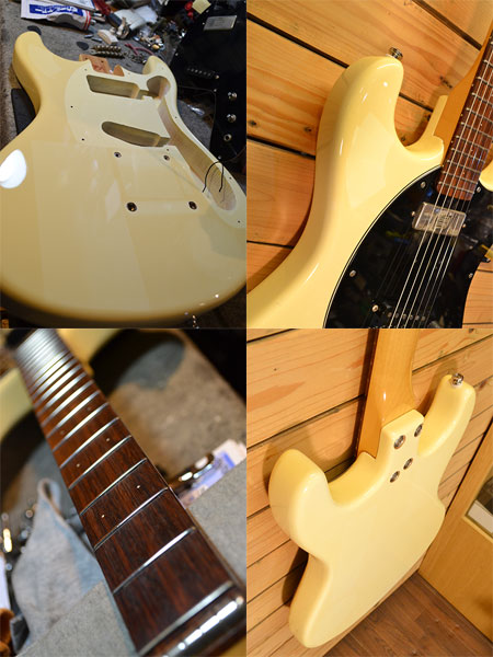 黒雲製(おそらく90年代後半から00年前半頃の物と思われます)。のモズライト「マーク2」モデル!Johnny Ramoneの使用でも有名なモデルです。コンパクトなシルエットのボディーにミディアムスケールネックを採用。ピックアップにはダンカン製ミニハムバッカー(フロント)とディマジオFS-1(リア)と個性的な組み合せ!ブライトで音抜けの良いサウンド!歪ませてもコード分離が良くパンクだけでなく幅広いジャンルに使える一本です。小傷や多少の使用感、ボディーにステッカー跡(焼け)がございますがフレット残量8分山程とタップリ残ってございますので演奏性の良い個体です。中古市場でもあまり出てこないモデルですのでお探しの方はお早めに! 付属品:汎用ソフトケース(新品)。