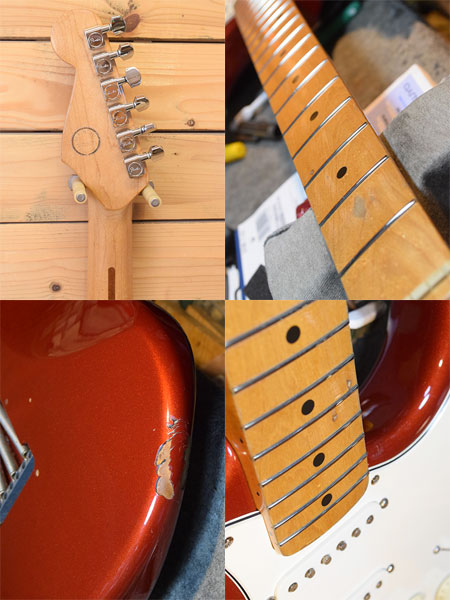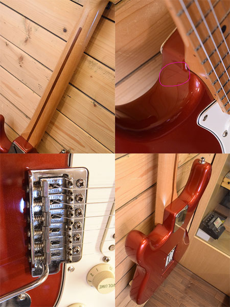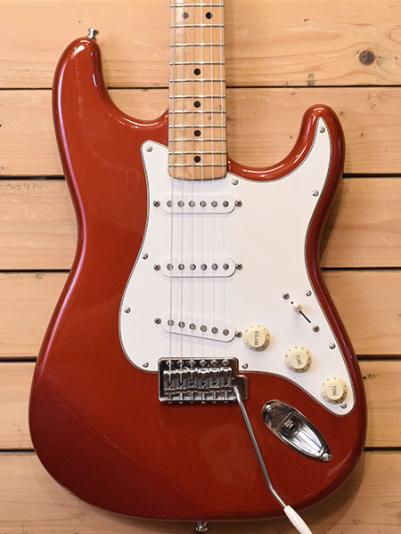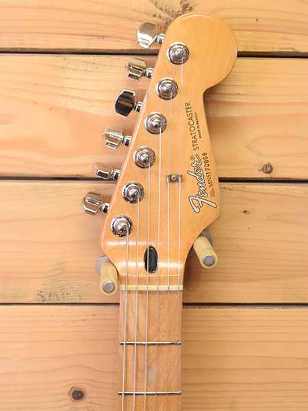 1995年製。ちょっと珍しい仕様のフェンダーメックス!通常この時期の個体はフェンジャパが展開していたSquier Series(ST-35)になるのですが、本機はアメスタ用ペグやインチサイズのベントサドル、電気系にはCTS POTやCRLセレクターなどUSA製パーツが使用されています。ボディー材は確認が難しかったですがおそらくアルダーかと思われます。ヘッド裏にはサンタモニカの楽器店「ACE MUSIC」のステッカーがございましたので当時現地にて購入された物かもしれません。かなり弾き込まれた個体でボディー下に大き目な打痕やネックジョイント付近に塗装クラックなどはございますがバッチリ調整&クリーニング済みの即戦力コンディション!フレット残量は6〜7部山となっております。珍しい個体です。気になった方はお早めに! ※ストラップピンはシャーラー製になっておりストラップ側のロックはございません。 付属品:汎用ソフトケース。