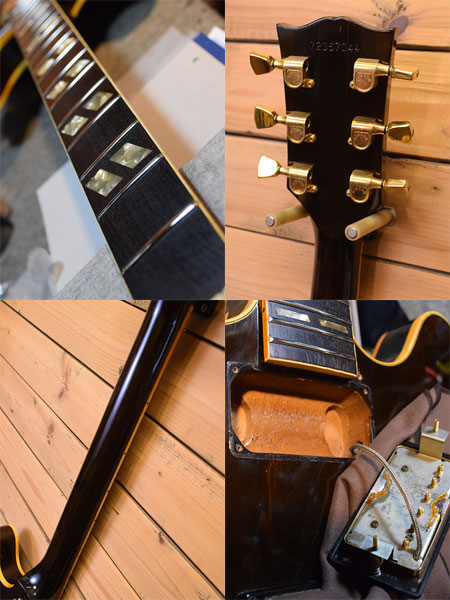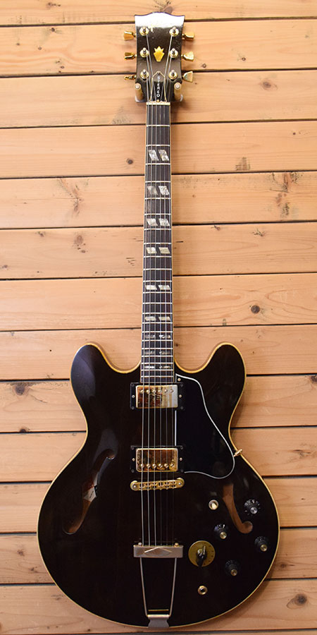カラマズーファクトリーの1977年製。ES-335の上位機種でお馴染みのES-345。バリトンスイッチによる多彩なサウンドとステレオ出力ならではのアンプ2台出しも可能なモデルです。ピックアップにはオリジナルの刻印ナンバードPAFが搭載されています。交換パーツはピックガード・リアボリュームノブ・リアTone POT程度でオリジナル度の高い個体です。勿論ステレオジャックも健在!フレット残量は5〜6部山程(オリジナルフレットかと思われます)。流石に小傷などはございますが大きく目立った傷は無く塗装コンディションも良い個体です。大変お買得な一本!お探しだった方は是非この機会をお見逃し無いよう願います。 付属品:オリジナルハードケース※ケース状態は悪いです。ケース裏シルク剥がれ・ヒンジ2ヵ所不良・鍵不良・取っ手針金補修あり。 保管用程度にお考えください。