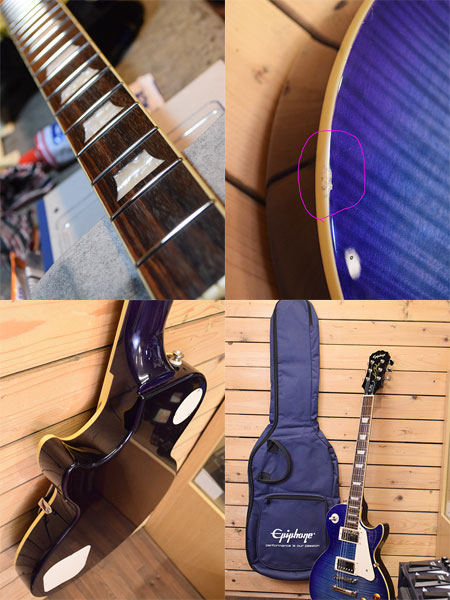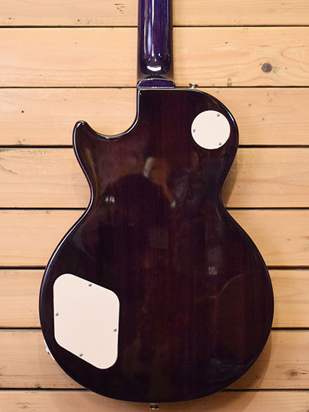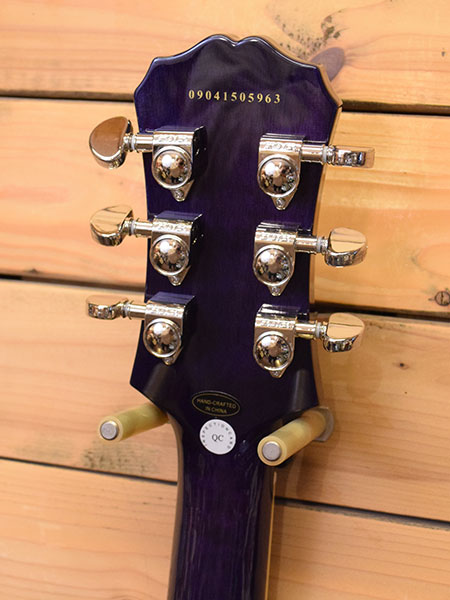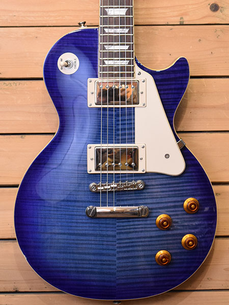 2009年製。鮮やかなシースルーブルーにトラ杢が映えるレアカラー!マホガニー+メイプルボディーにマホガニー+ローズ指板を採用した王道のウッドスペック!パワーバランスの良いオリジナルピックアップはレスポールらしいマイルドでロングサスティーンが楽しめます。ボディートップ端に傷(打痕を補修致しました。肌触りはツルツルです。)がございますがその他は目立った傷も無く年式の割には使用感の少ない綺麗なコンディションです。フレット残量も8分山以上残っており演奏性も良い個体です。他の人があまり持っていないカラーのレスポールをお探しの方に是非お勧めです。 付属品:オリジナルソフトケース。
