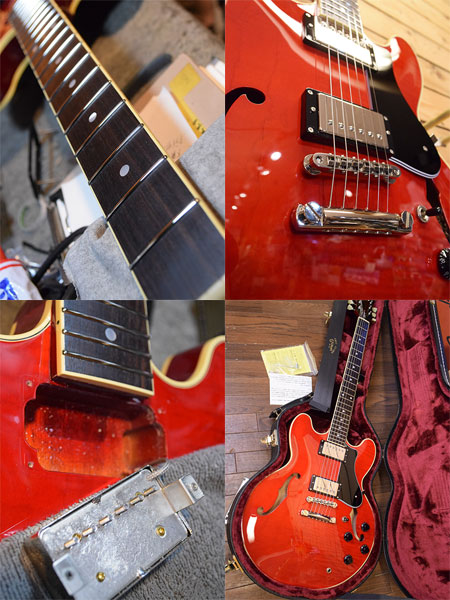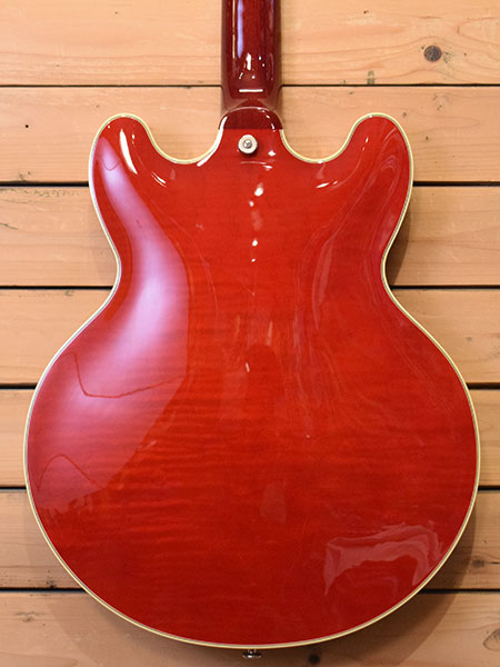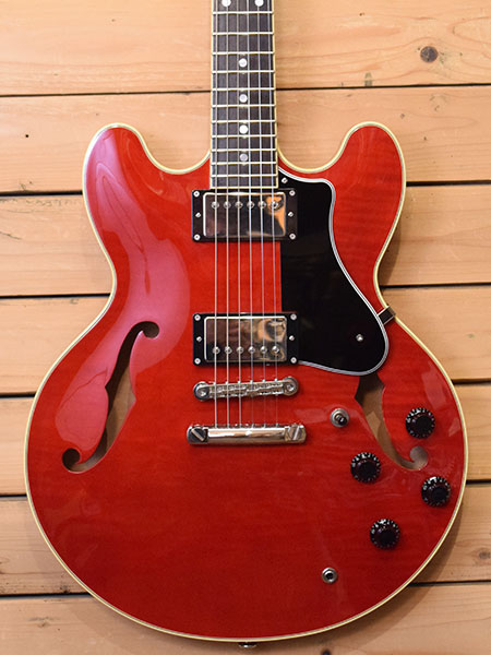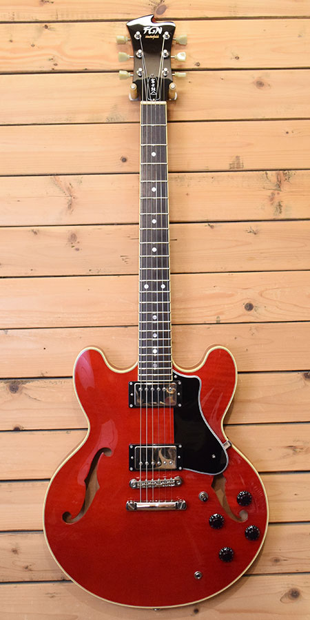 2014年製(定価225,000円+税)。ES-335とES-339の中間サイズ15インチボディーを採用したフジゲンのセミアコモデル。ボディートップ・バックには薄っすらとトラ杢が美しいカーリーメイプルを使用し、サイド・センターブロックにはマホガニーを削り出した構造が採用されています。フジゲンらしい大変精度の良い木工から鳴る煌びやかでエアー感のある上質なサウンドが楽しめる一本!ヘッドトップにヘアライン程度の小傷はございますが使用感がほとんど無い大変綺麗な個体。フレットの減りもほとんど無く、ピックガードのスクラッチ傷すらございません。全体の艶感も残った良質な個体です。お探しだった方は是非この機会に。 付属品:オリジナルハードケース・フレットガード・レンチ・紙類。