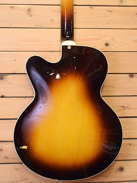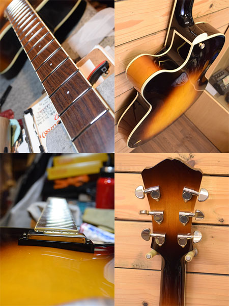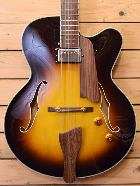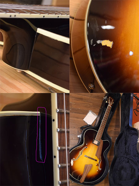 2014年製(新品売価16万円程)。メイプルラミネイト材を採用しトップ・バックにアーチ形状を施し、ラッカーフィニッシュまで採用した本格仕様!エアー感たっぷりなふくよかなサウンドながら煌びやかさもあるJAZZマン納得の一本です。全体的には綺麗な個体ですが、ボディーバックに大き目な打痕。ネックジョイントにクラックが走っています。2ヶ月程テンションをかけて様子を伺っていましたがネック角に変化はございませんでしたので問題は無いかと思われます。現在ダダリオのEJ20(10-46)にて調整済みでございます。ネックコンディションは良好でトラスロッドにも余裕はございます。ブリッジを一番下げた状態で6弦12f1.9mm、1弦12f1.5mmとなっております(現在セッティングは6G12f2.2mm・1G12f1.7mmとしています)。ご心配な点などございましたらお気軽にお問合せくださいませ。 付属品:オリジナルハードケース・紙類・レンチ。