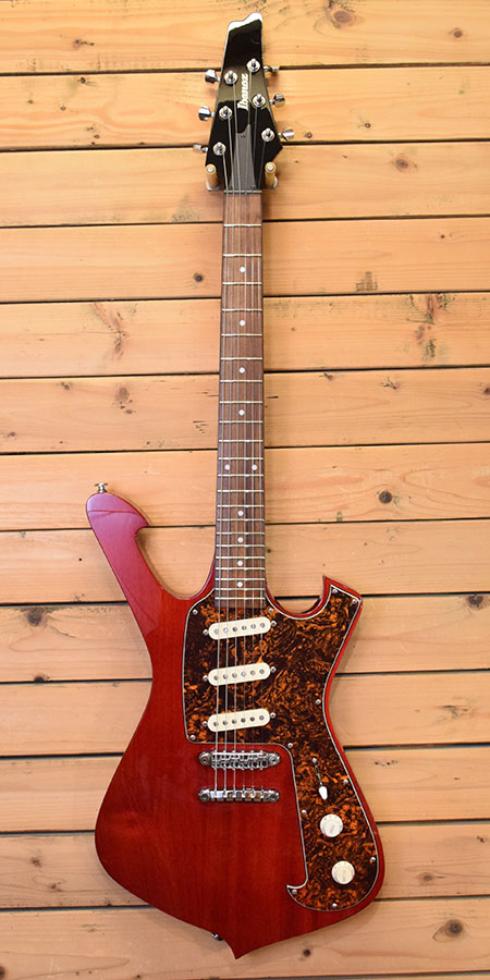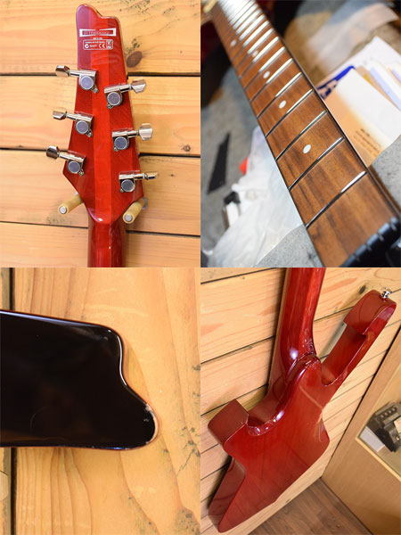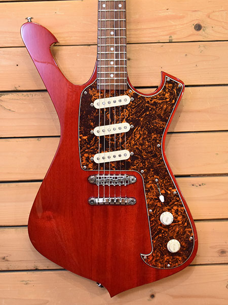 2011年製(定価135,000円+税)。MR BIGギタリスト Paul Gilbert Model です。アイスマンを逆さにしたような個性的なデザイン。マホガニーボディーを採用しピックアップにはディマジオのInjector(N&B)とArea67(M)を採用しています。セットネック構造も手伝ってエアー感のあるマイルドなシングルピックアップサウンドが印象的ます。POTやスイッチなど電気パーツははすべてUSA規格にアップグレードされています。ボディー裏にバックル傷とサイドに打痕など使用感のみられる個体にかかわらずフレット残量は8分山程とタップリ残っており演奏性の大変良い個体です。気になった方は是非この機会に!