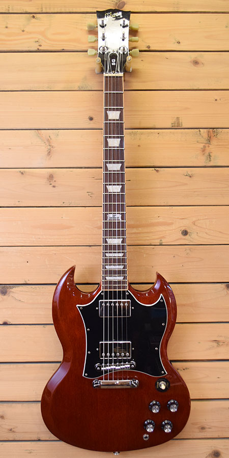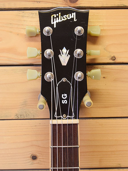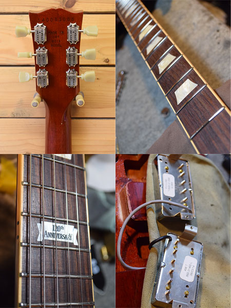 2014年製の120th Anniversary 800本限定モデル。グロス仕上げ、ラージピックガード、ディッシュインレイのスタンダードSG!単板マホガニーらしい煌びやかでエアー感のあるサウンドが魅力です。ピックアップにはパワーバランスに優れた490R&498Tが搭載されています。そして気になる重量は2.9kgと超ライトウェイト!ボディー周りに打痕や小傷など使用感はございますが、フレット残量はローフレに弾き減りはあるものの全体的な残量は8分山以上と演奏性の良い状態です(もちろんビビりなどもございません)。軽量で演奏性の良い個体をお探しだった方は是非この機会に。 付属品:オリジナルハードケース・紙類・レンチ。