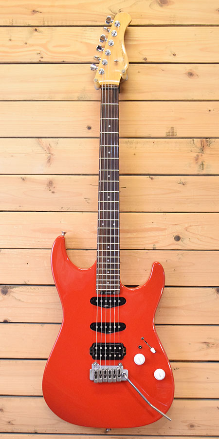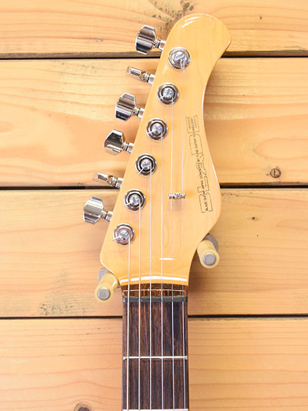型式など詳細不明なモデルです。ブレードでは珍しいコンポーネント系のボディーシェイプとヘッドデザイン。ボディー材はアルダーを使用。ブリッジはGotoh製Willkinson VS100、ペグもGotoh製ロック式が採用されています。ネック周りはロングスケールにナロートールフレットを採用、ラディアスは350R、ナット幅は42mmとなっています。電気系はオリジナルか判断が難しいですが、ブレードお得意のVSC(アクティブプリアンプ)は入っておらず、一般的なパッシブ回路となっています(VO/POTは新品交換、その他ハンダもリタッチ済みです)。ピックアップはオリジナルのようでハイパワーなハムバッカーと質のよいシングルPUが搭載されています(ミニスイッチはタップとトーンカットになっています)。ブレードらしい大変造りの良い個体です。重量は3.2kg。フレット残量も7〜8分山と演奏性もバッチリ!細かい傷など多少の使用感はございますがお手頃で良質なコンポ系をお探しの方に是非お勧めです。 付属品:汎用ソフトケース。