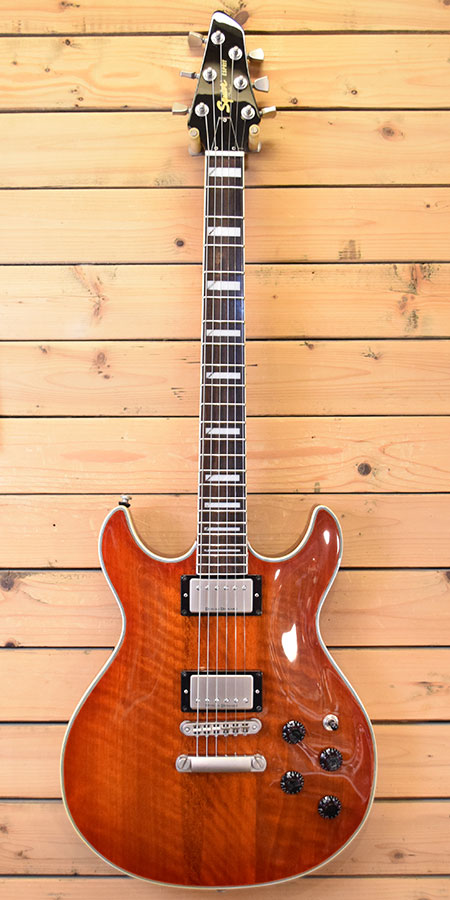 2006年製。05-06年の2年間しか製造されていなかったマスターシリーズの希少個体。好きな方はすぐにお気付きかと思いますが、ロベンフォードモデルをオマージュしたモデルであります。マホガニーボディー&ネック(ミディアムスケール)にダンカンデザイン製ピックアップを搭載しています。オールマホガニーらしいエアー感と煌びやかさのあるサウンドな印象です。ボディー裏(ネックジョイント付近)にストラップピン穴を埋めた跡がございます。多少の小傷などはございますが年式の割に使用感少な目綺麗な個体です。フレット残量も8分山以上残っており演奏性もバッチリ!お勧めな一本です。 付属品:汎用ギグケース。