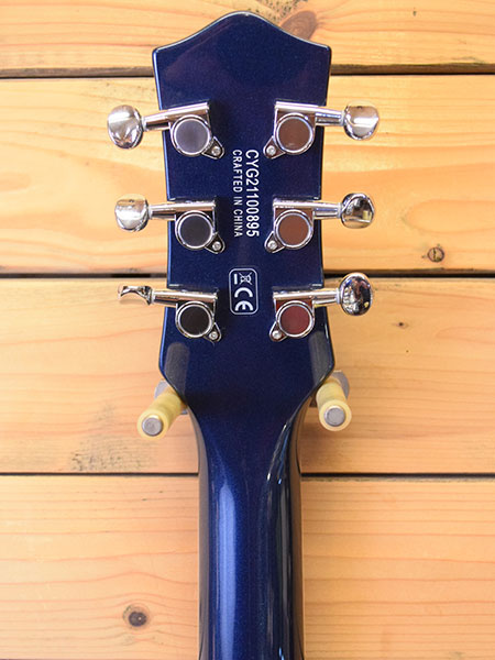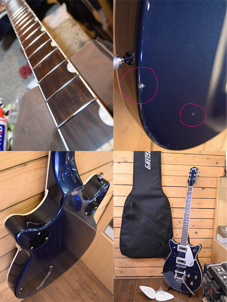 2021年製。ロックンロールのアイコン的存在のグレッチJET!チェンバーマホガニーボディーの煌びやかでパワー感もあるダブルカッタウェイ仕様の個体です。305Rラディアスの指板にミディアムジャンボフレットを採用した演奏性の良い仕様。オリジナルのブラックトップピックアップはハムバッカー構造でグレッチらしい芯のあるパワーバランスが良いサウンドが楽しめます。ボディーバックに2ヵ所打痕がございますがその他は使用感が殆ど無く大変綺麗な個体です。フレット残量も8〜9分山と満タン近く残っており演奏性も良い個体です。人と違ったトラディショナルなモデルをお探しの方にぜひ候補に入れて頂きたい一本です。 重量3.6kg 付属品:オリジナルソフトケース・紙類・レンチ。