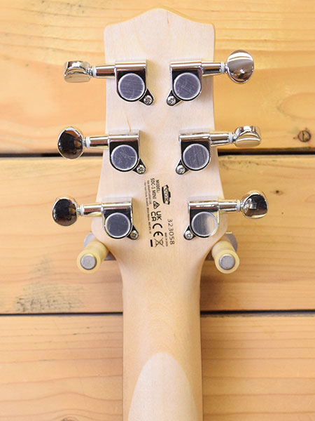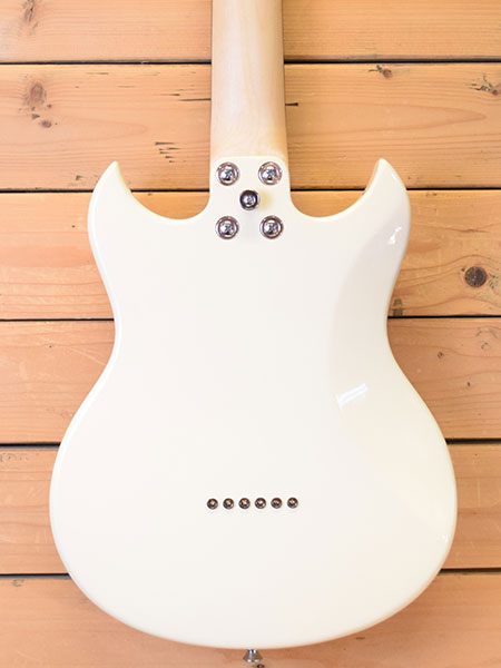 全長744mmのミニギターです。スケールは476mmとストラトよりも171mmも短く重量も2キロと軽量!超ショートスケールながら太い弦を張る事でピッチの不安定さを軽減しています。現在は11-48ゲージで調整済みです。量産モデルなので新品時はフレットのバリ取りやナット調整の甘さがありましたが本機はバッチリ調整済みとなっています。使用感も少なくフレット残量はほぼ満タンで大変綺麗な個体です。気になった方は是非この機会に。 重量:2.1kg 付属品:オリジナルソフトケース・取扱説明書・レンチ