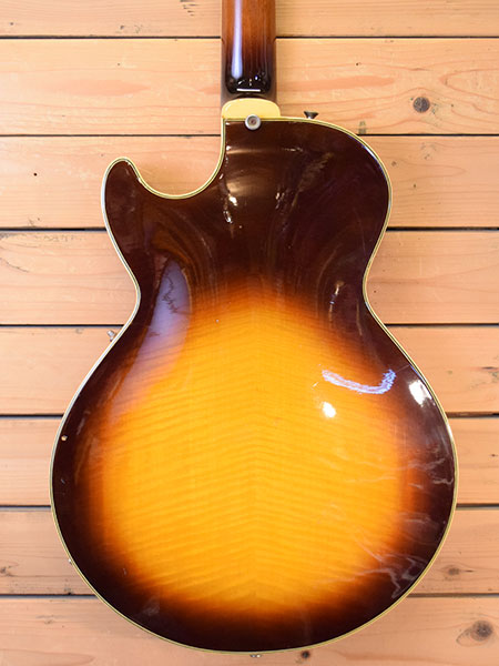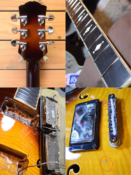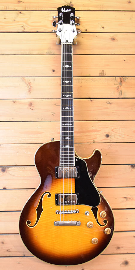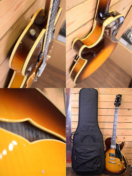 1970年代後半頃の渋谷ギターショップ「PACO(椎野楽器)」の渾身ブランド「ベスタグラハム」のセミアコモデルです。この技術は後のD'Angelicoにも生かされており、造りの良さから国内外に好評化を残した名シリーズでもあります。ボディートップ・バックには鮮やかなメイプル材を3Pで使用しており、覗かないと見えない内側までも美しいトラ杢材を使用しています。指板にはエボニー材を採用しポジションマークにも細やかなデザインを使用しています。ジャンボフレット採用や当時では高価なグローバーペグを採用し演奏性とチューニング安定性を妥協無く突き詰めた拘りの一本です。フロントピックアップは交換されておりリアPUとのバランスマッチングも取れています(交換PUはメーカー不明)。ブリッジはGOTOH製のナイロンサドルに交換されておりペグも近年のグローバーに交換されています。ボリュームPOT2個も近年交換されています。ヘッドトップはリフィニッシュされており「Graham」の文字が消えています。ボディートップにネジ穴を埋めた跡が2か所ございます(おそらくギターシンセピックアップ跡)。フレット残量は6〜7分山程ですがジャンボフレットなので演奏性は良い個体です。トータルバランスの良い良質な国産セミアコです。改造点が多い実用的な個体!大変お買得です! 重量:3.8kg 付属品:汎用ギグケース