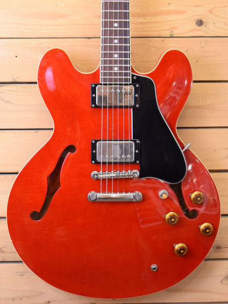 2003年製(日本製)。ドットポジションマーク・プレーントップのロングセラーモデル(2018年以降の定価は180,000円)。メイプルセミホーローボディーにマホガニーネックを組み合わせた王道スペック!ピックアップにはオリジナルPAF Vintage MK2が搭載されておりエアー感があり曇りのないサウンドが魅力です。ヘッド周りの傷やボディーにも多少の小傷がございますが程良く弾き込まれており鳴りの良い個体です。フレット残量は7〜8分山と演奏性の良い個体です。トラスロッドにも十分な余裕はございますので今後の調整も問題ございません。良い雰囲気の個体です。気になった方は是非この機会に。 重量:3.2kg 付属品:オリジナルハードケース